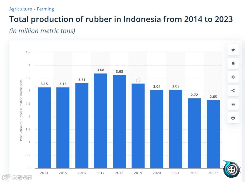 根据 Statista 的数据,泰国是世界上最大的天然橡胶生产国,印尼是全球第二大天然橡胶生产国。2023年,印尼的天然橡胶产量达到265万吨,种植面积达361万公顷,占全球橡胶产量的20%以上。