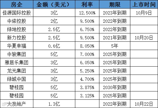 不完全统计,截止22日,10月份已有碧桂园、雅居乐集团、龙光集团等11家房企发布海外融资,金额合计35.9亿美元。据公告显示,上述海外融资所得款项基本均用于现有债务再融资、一般企业用途等。