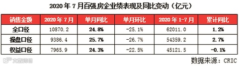 根据克而瑞研究中心日前发布的报告显示,7月份TOP100房企实现销售操盘金额9386.4亿元,单月业绩同比自4月转正后逐月回升,进一步提升至25.7%,单月业绩环比降幅也低于去年同期。