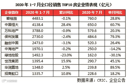 如果根据1-7月份的全口径销售金额核算,碧桂园、中国恒大和万科仍然位列前三,销售金额分别为4483.1亿元、4138.4亿元和3788亿元。除上述三家房企外,包括保利发展、融创中国、中海地产、绿地控股、世茂集团、华润置地、招商蛇口、龙湖集团、中国金茂、金地集团、新城控股、阳光城、金科集团和旭辉集团在内的17家房地产企业全口径销售金额都超过了1000亿元,相比上月增加了4家企业。