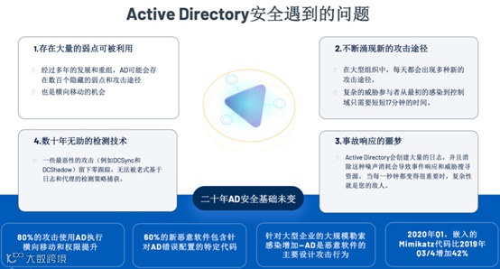 据Frost&Sullivan统计,全球有超过90%的财富1000强企业正在使用Active Directory作为身份验证和授权的主要方法,80%的攻击使用Active Directory进行横向移动和权限提升,60%的新恶意软件包含针对Active Directory错误配置的代码。这种风险从未像今天这样严重,如今有越来越多员工在远程工作,经常使用个人设备连接到公司系统。而Active Directory在托管单点登录中也扮演着关键角色。保护账户——员工、服务承包商、临时员工、系统账户和其他人——以及他们跨系统的访问和权限,对企业网络安全态势具有战略意义。了解帐户对系统的访问以及这些系统如何在计算环境中关联是对漏洞管理和系统安全的一个战略性和重要的补充,对于全面管理风险(尤其是在复杂的云和混合环境中)越来越必要。