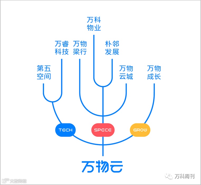 现场公布的品牌树显示,万物云包含Space、Tech和Grow三大模块。其中,Space模块包含归属社区空间服务的“万科物业”、“朴邻发展”,归属商企空间服务的“万物梁行”,和归属城市空间服务、全国首个以城市服务为定位的全新品牌“万物云城”;Tech模块则包括“万睿科技”、“第五空间”,分别提供软硬件服务能力、数字运营和行业人工智能服务;Grow模块的“万物成长”是公司的孵化器,持续连接成熟企业、孵化创新企业。