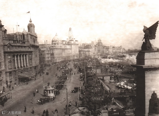 民国时期的外滩,图中可见矗立的欧战纪念碑(即和平女神像),为纪念在第一次世界大战期间上海外国侨民回国参战的死难者而建,1924年落成