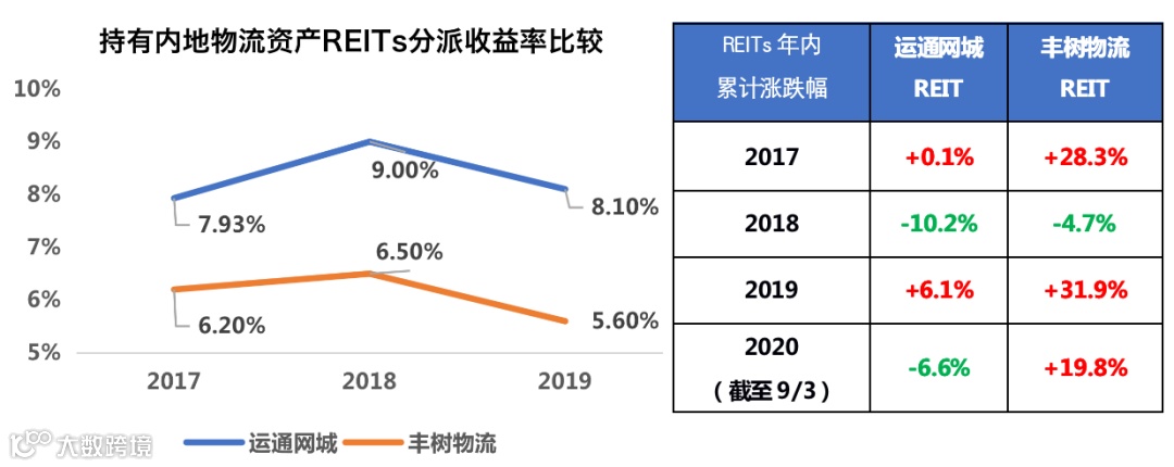 在多国布局物流资产并由成熟REITs管理人丰树管理的丰树物流REIT,受益于近三年来资产运营效率持续改善,被市场看好,近3年平均涨幅近20%,今年随着疫情带来的一系列物流需求的增长,截至9月3日收盘,丰树物流不但修复了3月美股大跌时的跌幅,更较年初上涨了近20%。
