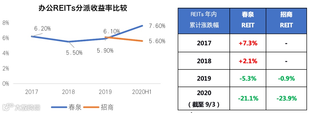 拥有办公资产的两只REITs分别为春泉产业信托(下称春泉REIT)及招商房地产信托(下称招商REIT)。春泉REIT在内地仅一处资产,位于北京市朝阳区建国路,是北京核心CBD区域,交通便利,位置优越,连年保持高于市场平均水平的出租率。招商REIT在拥有四处办公资产及一个商业资产,均位于深圳前海蛇口自由贸易区的核心区域。