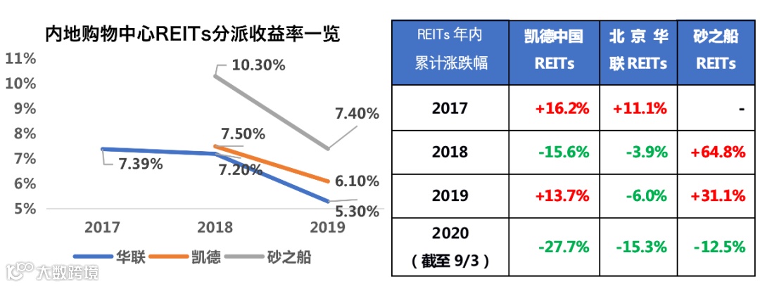 拥有内地购物中心类资产的海外REITs共有三只,分别是北京华联商业信托(下称北京华联)、凯德商用中国信托(下称凯德中国REIT)和砂之船商业信托(下称砂之船),这三只REITs均为100%内地资产REITs。