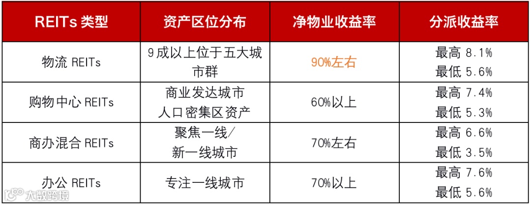 综上可以发现,物流REITs的资产要求最高但其分派收益率也是最高的,达5.6%-8.1%,购物中心REITs次之,为5.3%-7.4%,最低的是商办混合REITs,约3.5%-6.6%。