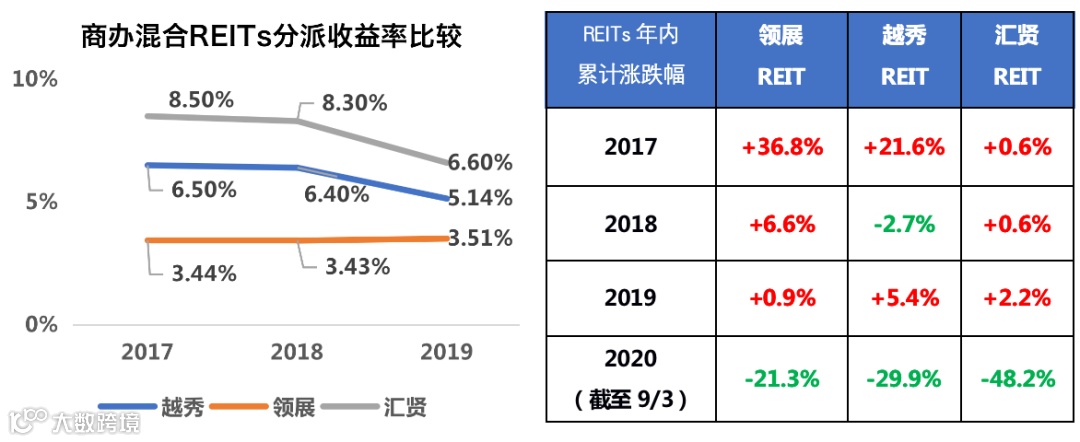 另一方面,近3年底层资产运营效率一直有所下滑的汇贤REIT的分派收益率也在不断下滑,2019年较2018年下降1.7个百分点,下降幅度较大,这主要是由于2019年营商环境较为困难,持有物业收入减少,同时为了维持物业平稳运营,保持充足的营运现金流,将分派比例由100%将至90%,造成2019年整体收益率下降。