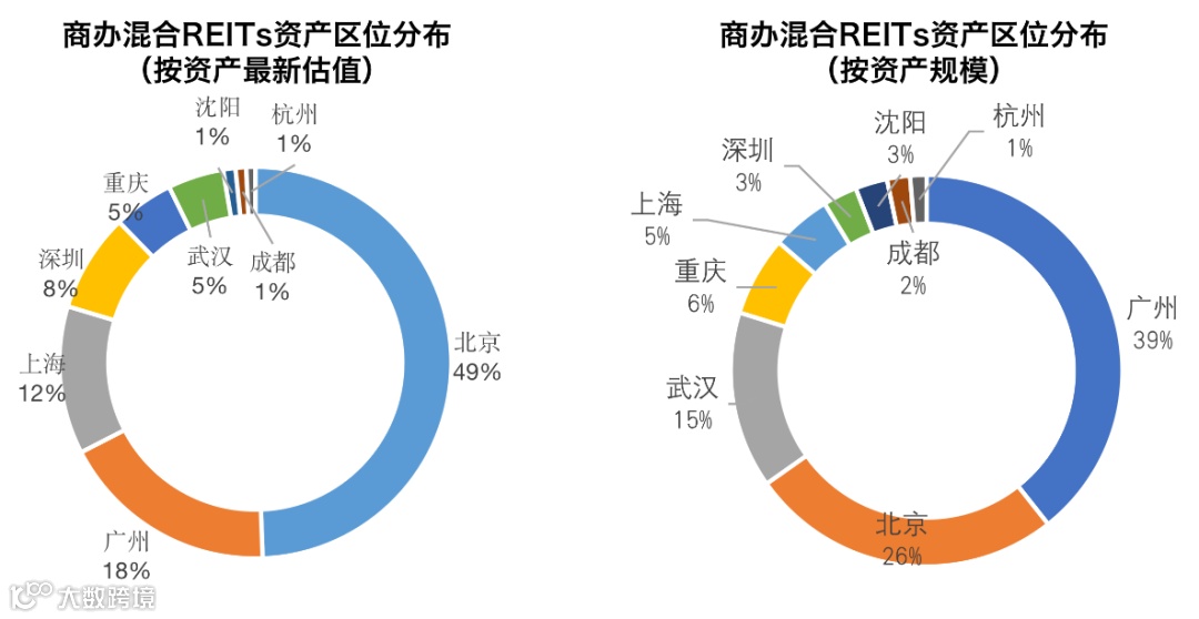 在拥有中国内地资产的海外REITs中,越秀产业信托(下称越秀REIT)、领展产业信托(下称领展REIT)及汇贤产业信托(下称汇贤REIT)是以商办类资产为主,均分布在一线及新一线城市。