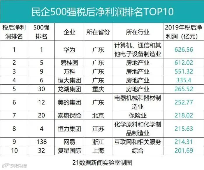 同时,2019年民营企业500强的利润水平保持增长势头,但增幅收窄。从税后净利润情况来看,超过百亿的有22家,较上年增加1家,华为以2019年税后净利润626.56亿元,成为今年榜单上最赚钱的企业,广东企业碧桂园和万科紧随其后。