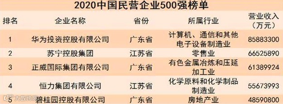 9月10日上午,全国工商联在北京发布2020年中国民营企业500强榜单。今年榜单前三的格局发生了变化,依次是华为投资控股有限公司(下称“华为”)、苏宁控股集团(下称“苏宁”)、正威国际集团有限公司。去年榜单的前三则分别是华为、海航集团和苏宁。其中,华为今年以8588亿元的营业收入蝉联民企500强榜首、制造业民营企业500强榜首。