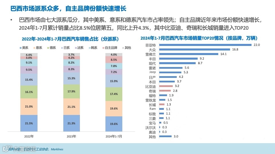 巴西是全球第一个普及灵活燃料汽车的国家。在电气化浪潮下,巴西电动汽车市场近年来发展迅速,自主品牌市占率近40%,已成为自主品牌新能源出口的新方向。