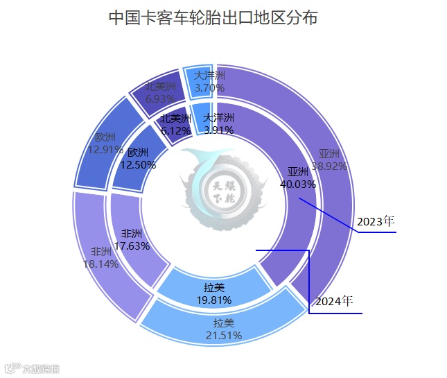 卡客车轮胎:总金额达到98.74亿美元,出口数量为12665.03万条。其中,亚洲市场占据了最高的出口比例,达到40.03%;拉美地区占19.81%,非洲则占17.63%。