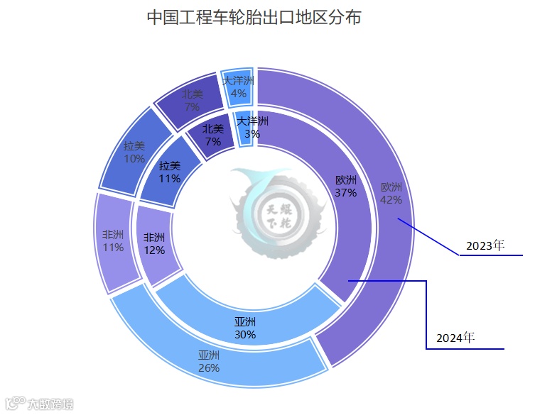 工程车轮胎:总金额达到了21.32亿美元,出口数量为1751.94万条,重量为68.78万吨。其中,欧洲市场占据了最高的出口比例,达到36.44%;亚洲市场占比为29.88%,而非洲市场则占12.24%。
