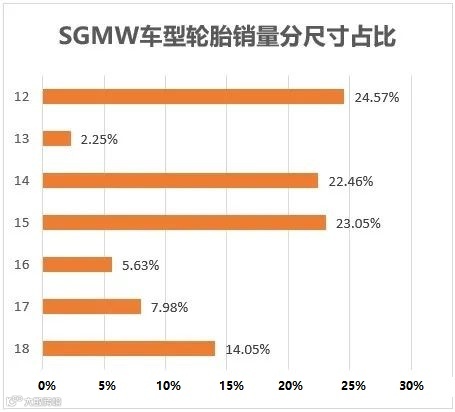 由于SGMW销售主要集中在微型和小型纯电动车,这些车型通常使用较小尺寸的轮胎(12、14和15寸),使得这几种尺寸的轮胎占到了总需求的70%。相对而言,19寸以上的大型轮胎在SGMW的车型中几乎没有应用。