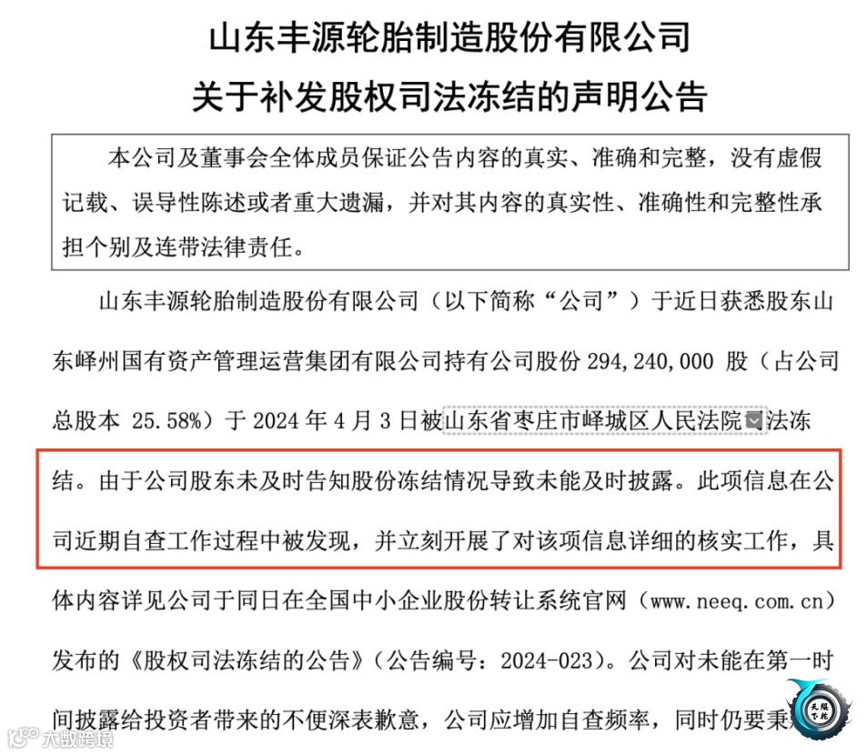 山东丰源轮胎制造股份有限公司近日再度陷入股权冻结风波。据悉,公司二股东山东峄州国有资产管理运营集团有限公司(峄州国资集团)所持约2.94亿股公司股权被司法冻结,原因主要是股权转让纠纷。这是峄州国资集团今年内第三次遭遇类似情况。