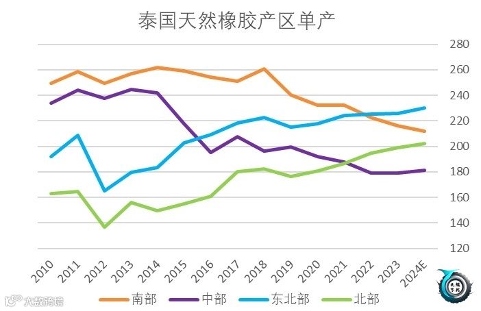 泰国作为全球最大的天然橡胶生产国,其供应能力多年来一直备受关注。总体来看,泰国的天然橡胶种植面积保持稳定,但开割面积增速放缓,这导致总产量增速也相应放缓。割胶收益、树龄结构、天气变化等因素对产量产生重要影响。今年,虽然高价刺激了割胶的积极性,但南部地区树龄老化可能带来的减产是否能被其他产区补足,仍存在较大不确定性。