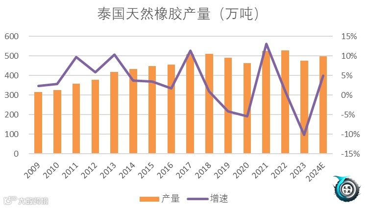 数据显示,今年泰国天然橡胶总产量预计同比增加3%-5%。虽然产量有所增加,但与2017年和2021年高价时期相比,增速偏弱。这一现象验证了泰国供应能力的衰减,但同时也表明其供应仍具有一定弹性。
