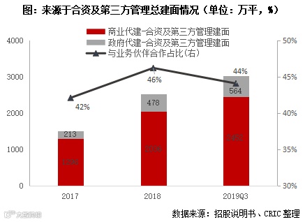 截至2019年三季度末,绿城管理在中国 84个城市,以及柬埔寨城市拥有262个代建项目,管理总建面为6850万平,其中合作代建项目面积占比达44%。2017年以来,绿城与合资及第三方的合作代建项目占比都维持在40%以上,合作比例相对较高,有助迅速抢占目标市场和区域。