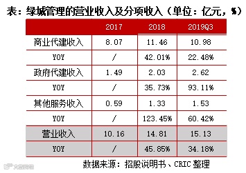 2019年前三季度,绿城管理实现营业收入15.13亿元,同比增长34.18%,增速较2018年有所放缓,主要是对营收贡献最大的商业代建收入(占比72.57%)增速放缓所致。从分项来看,2019年前三季度,商业代建收入10.98亿元,同比增长22.48%;政府代建收入2.62亿元,同比增长93.11%;其他服务实现收入1.53亿元,同比增长60.42%。