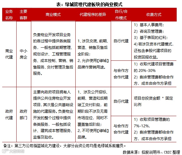 值得关注的是,自2019年初起,绿城的商业代建开始涉足资本代建,即绿城管理就符合投资标准的代建项目进行小额资本投资,或绿城管理提供增信,再引入金融机构或房地产基金为代建项目提供融资,以解决中小房企等委托方的融资困境。如绿城管理于2019年9月底以债务融资形式向旗下管理项目作出有限注资,并计划未来进一步拓展该模式。
