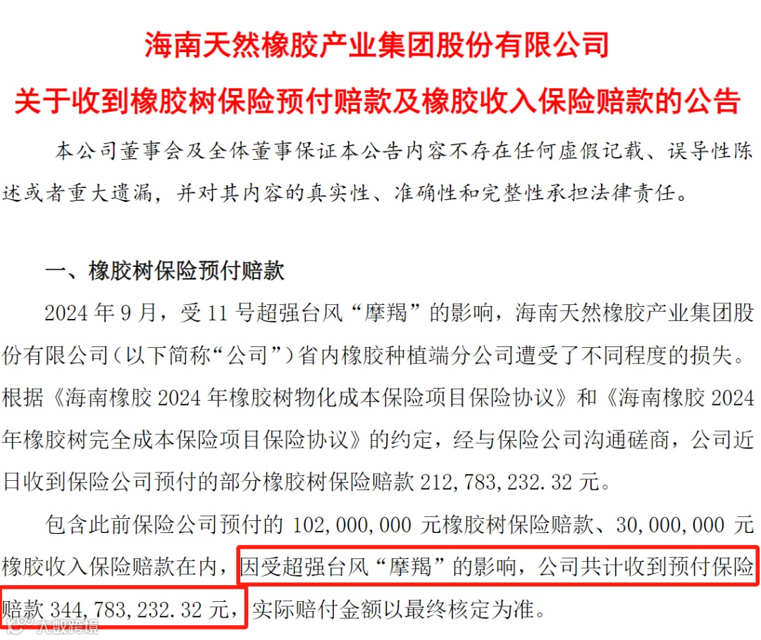 海南橡胶于9月19日晚间发布公告,因受超强台风“摩羯”影响,公司共收到预付保险赔款约3.45亿元。这一赔偿金额已超过公司2023年全年净利润2.97亿元,成为该公司历史上获得的一次性保险赔款之最。
