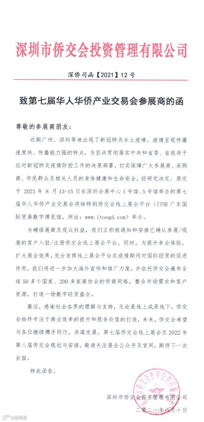 大参展商、采购商、市民群众及相关人员的身体健康和生命安全,经研究决定: 原定于 2021年 8 月13-15日在深圳会展中心1号馆、5号馆举办的第七届华人华侨产业交易会将转移到侨交会线上