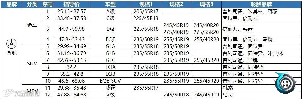 奔驰车型选择的原配轮胎品牌涵盖了多种国际知名品牌,以确保其车辆性能和驾乘舒适性。