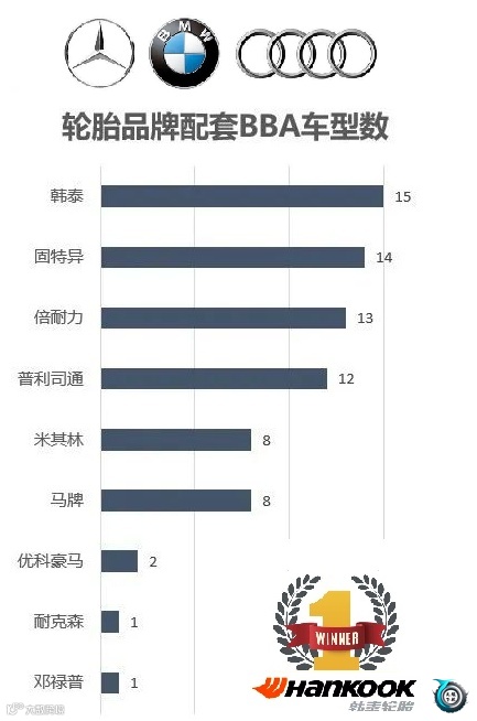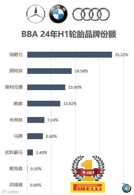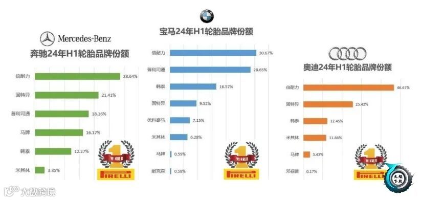 在BBA的原配市场上,六大轮胎品牌(倍耐力、固特异、普利司通、韩泰、米其林、马牌)占据了97.25%的市场份额。其中,倍耐力凭借其在奔驰的C和E级、宝马的3系、5系以及X3、X5,还有奥迪的A4L、A6L和Q5L等畅销车型上的应用,占据了总份额的35%。