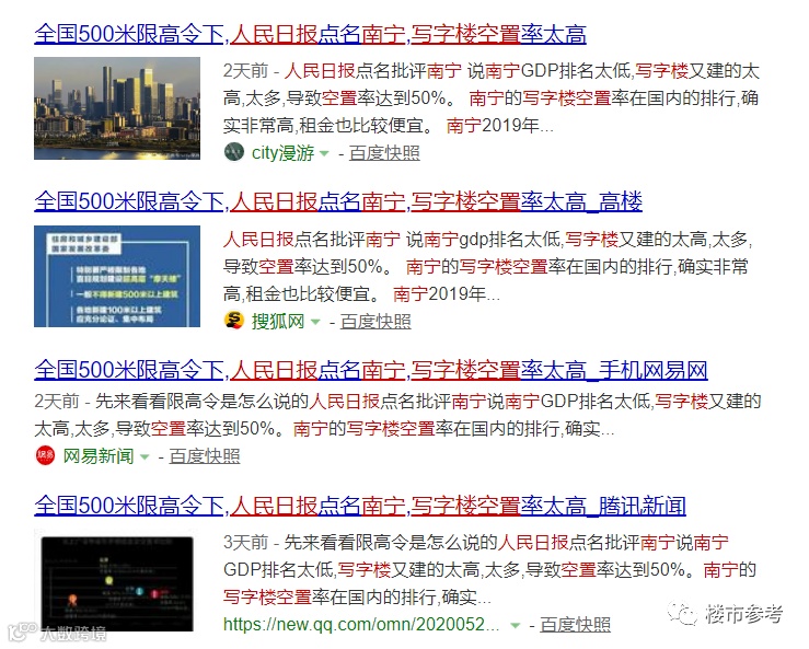 日前,笔者在网上看到一篇说南宁因写字楼空置率太高而被人民日报点名的文章,并附上了文章截图。随后笔者特地到人民日报官网和公众号查了下,不过并未查到那篇文章。