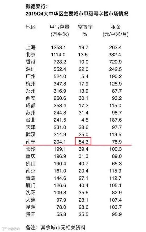 在戴德梁行统计的24个主要城市(含港台)中,南宁分别拿下空置率正数第一(也是唯一一个空置率过半的城市)、租金水平倒数第二。