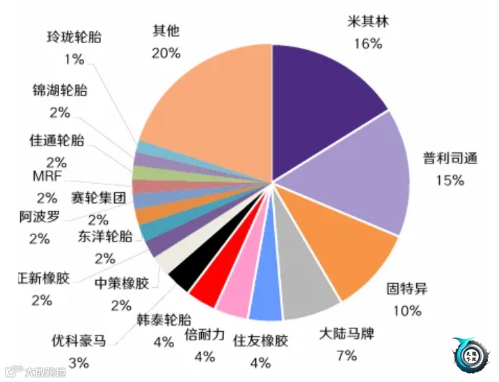 目前的市场格局方面,米其林、普利司通、固特异、德国马牌市占率分别为16%、15%、10%、7%,合计占据全球市场份额的48%。而国内胎企基本处于第二、第三梯队。其中,赛轮轮胎占比2%。