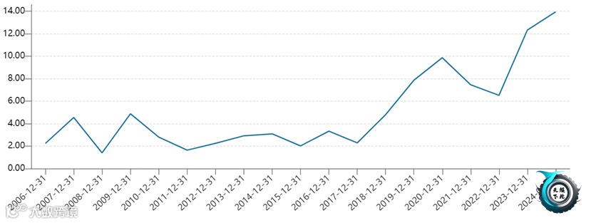 截止2024第三季度,“赛轮”净利率从2017年底的2%-3%水平提高至2024年第三季度的13.96%。截止2024Q2,海外巨头米其林、普利司通、固特异、倍耐力净利率分别为8.63%、9.33%、0.24%、-1%,均弱于赛轮轮胎。
