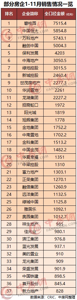 根据榜单,1-11月份共有碧桂园、中国恒大、万科地产、融创中国、保利发展、中海地产、绿地控股、新城控股、世茂房地产、华润置地、龙湖集团、招商蛇口、阳光城、旭辉集团、金地集团、中南置地、金科集团、中国金茂、华夏幸福、中梁控股、富力地产、正荣集团、融信集团、远洋集团、绿城中国、雅居乐、奥园集团等27家房地产企业的全口径销售金额超过千亿元。相比前十月,本次“千亿阵营”中增加了绿城中国和奥园集团两家企业。