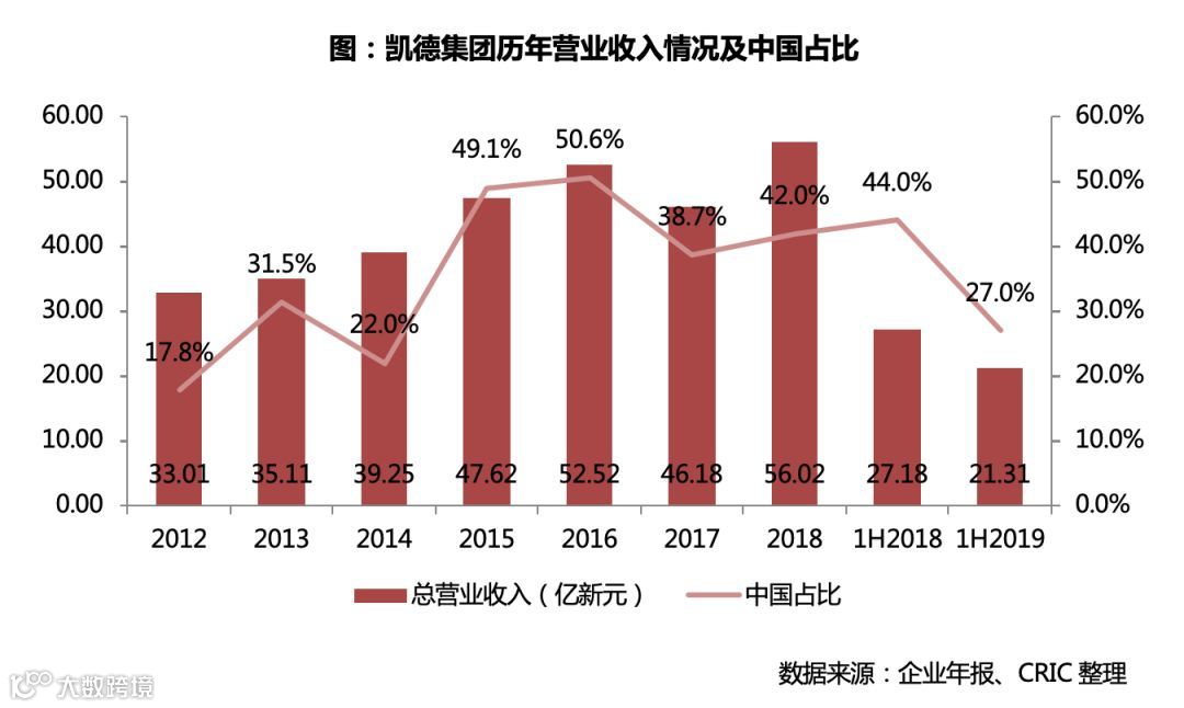 从营业收入情况来看,2019年上半年凯德集团实现营业收入21.31亿新元,约108.27亿元人民币,其中中国业务的营收占比为27.0%,同比下降了17个百分点,主要由于中国住宅部分的结转收入单价较低,从而降低了营业收入。从历年数据来看,凯德逐渐加大在中国的布局,这部分投资也渐渐为凯德贡献着不菲的营收,近年来其营业收入的40%左右都来自于中国。
