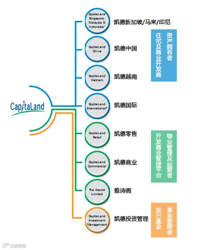 凯德集团是一家亚洲的多元化房地产集团,总部位于新加坡,其投资组合横跨多元房地产类别,包括办公楼、购物中心、产业园区、工业及物流地产、商业综合体、城镇开发、服务公寓、酒店、长租公寓及住宅,集团业务遍及全球30多个国家的200多个城市。此外凯德集团还拥有全球领先的房地产投资管理业务规模,旗下共管理8支上市房地产投资信托基金(REITs)和商业信托,以及20多支私募基金。
