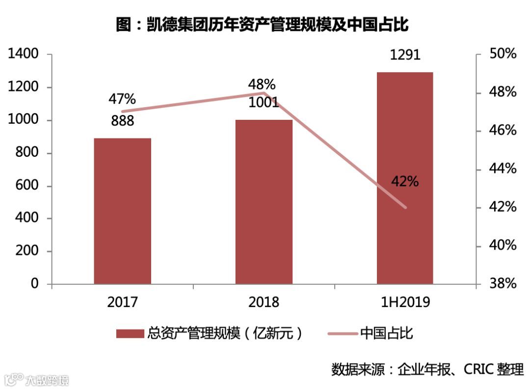 截至2019年上半年,凯德集团的资产管理规模1291亿新元,约6559亿人民币,较期初增长29.0%。其中,在中国43座城市拥有/管理200多个项目,在中国的总开发规模约2300万平方米,管理的总资产2755亿元人民币,占比42%,较于2018年年末下降了6个百分点,主要由于凯德自2018年出售20家购物中心予印力后,围绕五大核心城市群不断调整在中国各大区域的项目部署,于2019年6月又出售了3家购物中心,从而使得2019年上半年末资产管理水平相对下降较多。