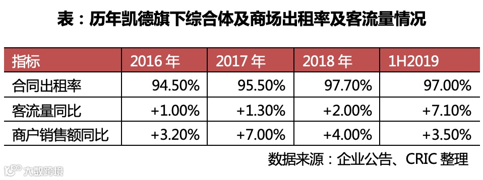 从凯德旗下商业项目历年的出租率来看,凯德凭借项目的地段优势、强大的招商及运营能力,其商业项目的出租率均维持在90%之上,其中2019年上半年更是达到了97%,与2018年大致持平。此外历年客流量及商户销售额均有不同程度的提升,其中2019年上半年客流量同比增长7.1%,商户销售额同比增长3.5%。较高的出租率,为凯德的租金收入规模稳定增长提供了保障。