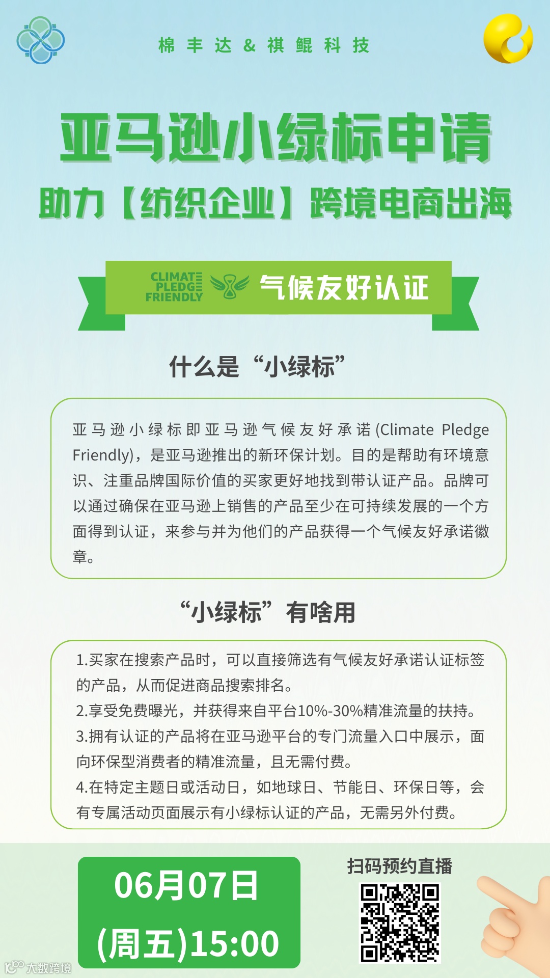 祺鲲科技携手棉丰达举办专场直播,行业总监浦天贶将为大家深入介绍亚马逊“小绿标”的申请流程,以及对产品销量增长的重要意义,共同探讨纺织行业的环保趋势。