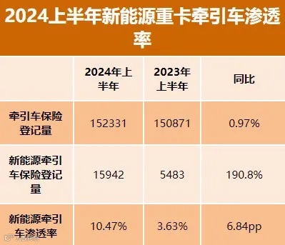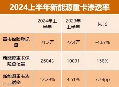 根据最新数据显示,2024年上半年,重卡市场的保险登记量达到21.2万辆,其中新能源重卡的注册量为26,043辆,同比激增了158%。新能源重卡的渗透率已达12.29%,较去年同期提高了7.78个百分点。这一显著增长表明新能源重卡在市场中的接受度和渗透率正在迅速提高。