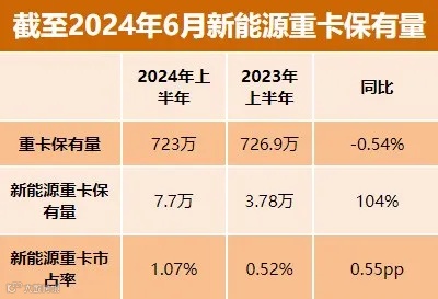 截至2024年6月,中国重卡的总保有量为723万辆,其中新能源重卡的数量为77,020辆,占整体市场的1.07%。