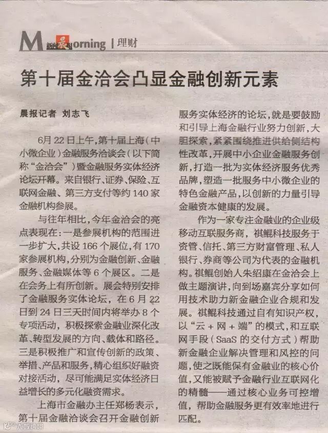 导读:祺鲲科技的创新技术与业务模式,帮助了金融行业客户其核心业务的拓展和互联网化,为客户带来的创新增值。祺鲲独有的商业模式引起上海知名主流媒体《新闻晨报》的关注并主动对祺鲲进行报道。今日头条、光明网、解放网