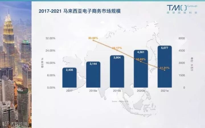 目前,马来西亚电商正处于高速发展阶段。预计至2021年,马来西亚的电子商务市场规模将增至50.77亿美元, 并于2017-2021年间达到20.50%的高速复合年增长率。