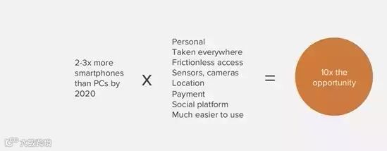2020 年,智能手机数将达到 PC 的 2—3 倍,但乘以移动设备便携易用带来的便利,移动设备将能提供 10 倍于 PC 时代的机会。