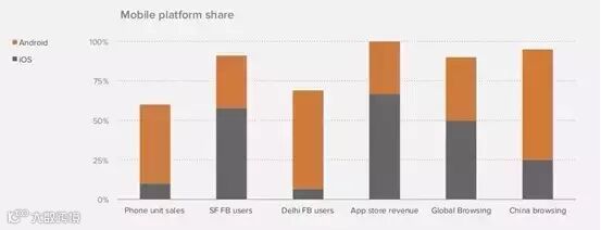 如上图,全球销量看,Android 手机明显多于苹果;但 Facebook 旧金山用户中,苹果设备使用者多于Android,同时在雅加达,情况则反过来;另外,苹果应用商店收入明显高于 Google Play;而以全球浏览器上网数据看,苹果略高于 Android,但中国数据则完全相反,Android 明显多于苹果。