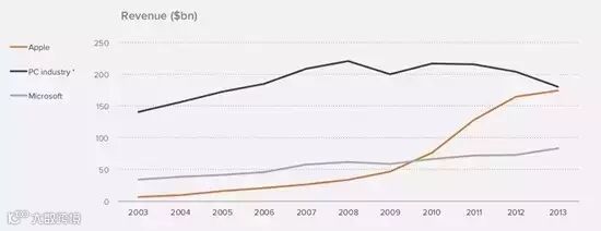 微软在 PC 领域销售份额持续下滑,已从超过 85% 份额,掉到不到 25%;而苹果却快速占领市场,从收入看,几乎接管 PC 业,在 2013 年达到 1750 亿美金。