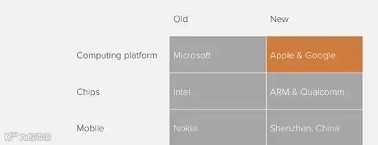 硅谷和中国成为新时代中心,代表公司:电脑领域谷歌和苹果,打败微软;芯片领域 ARM 和高通,打败英特尔;手机行业,中国深圳打败原生产诺基亚的芬兰。