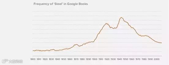 另一重要事实:当一项技术被充分普及,它就被社会“内化”成理所当然的一部分,人们也就不再谈论它。以下几张图,显示了“铁路”、“钢铁”、“计算机化”等技术词汇在 Google Books 出现的频率: