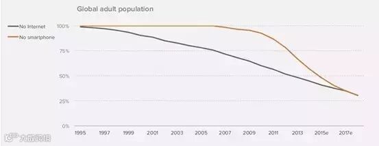4. 1995 年至今,不上网或没智能手机的成年人数持续收缩:前者从 1995 年近百分百降至 2017 年约 36%;后者从 1995 年百分百降至 2017 年约 28%。