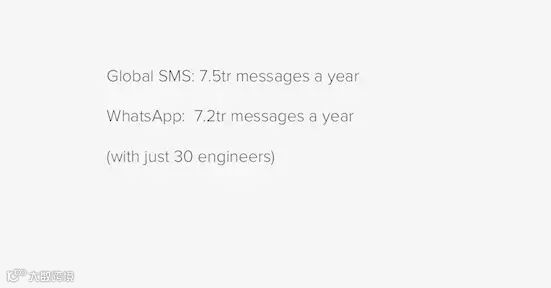 Facebook 和 WhatsApp 是最典型例子。两年内,Facebook 移动广告收入就翻倍,成为一个体量达 65 亿美金的海量客户部门;而只有 30 个工程师的 WhatsApp 一年内信息流量已达到 72 亿条,要知道,全球短信总量是每年 75 亿条。